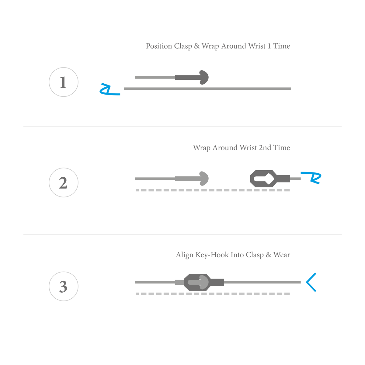 This bracelet is available in four bracelet lengths, 17cm, 19cm, 21cm or 23cm in circumference. To take the bracelet on or off your wrist, simply double wrap the bracelet, then align the key-hook with the hole within the clasp and secure. Less is More.